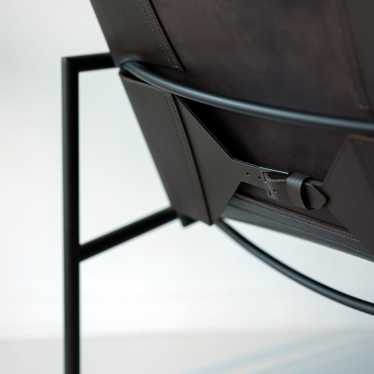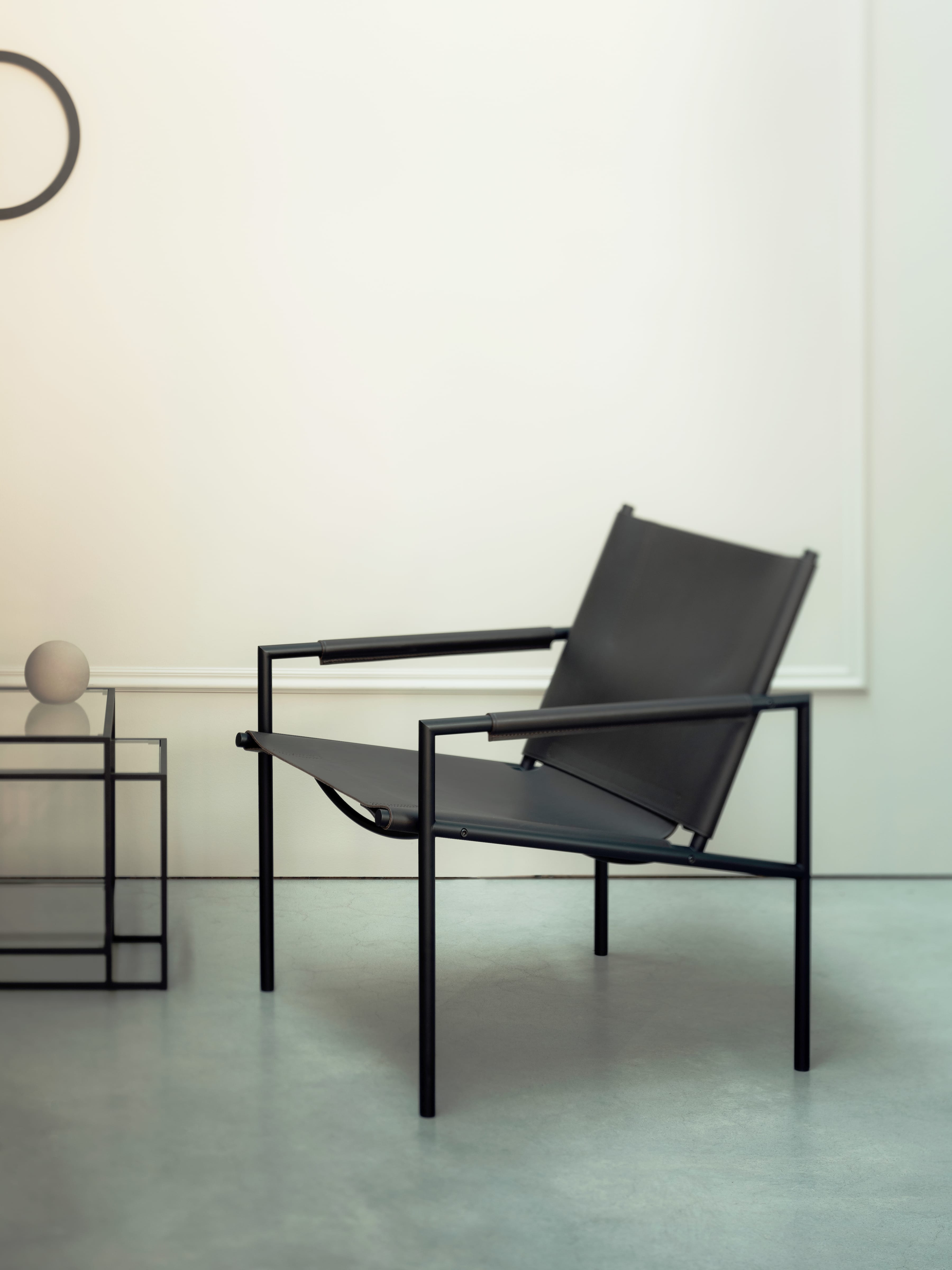 - Material descriptionFrame: brushed chrome or black powder coated steel (RAL 9005) // Upholstery: saddle leather in natural, dark brown, or black