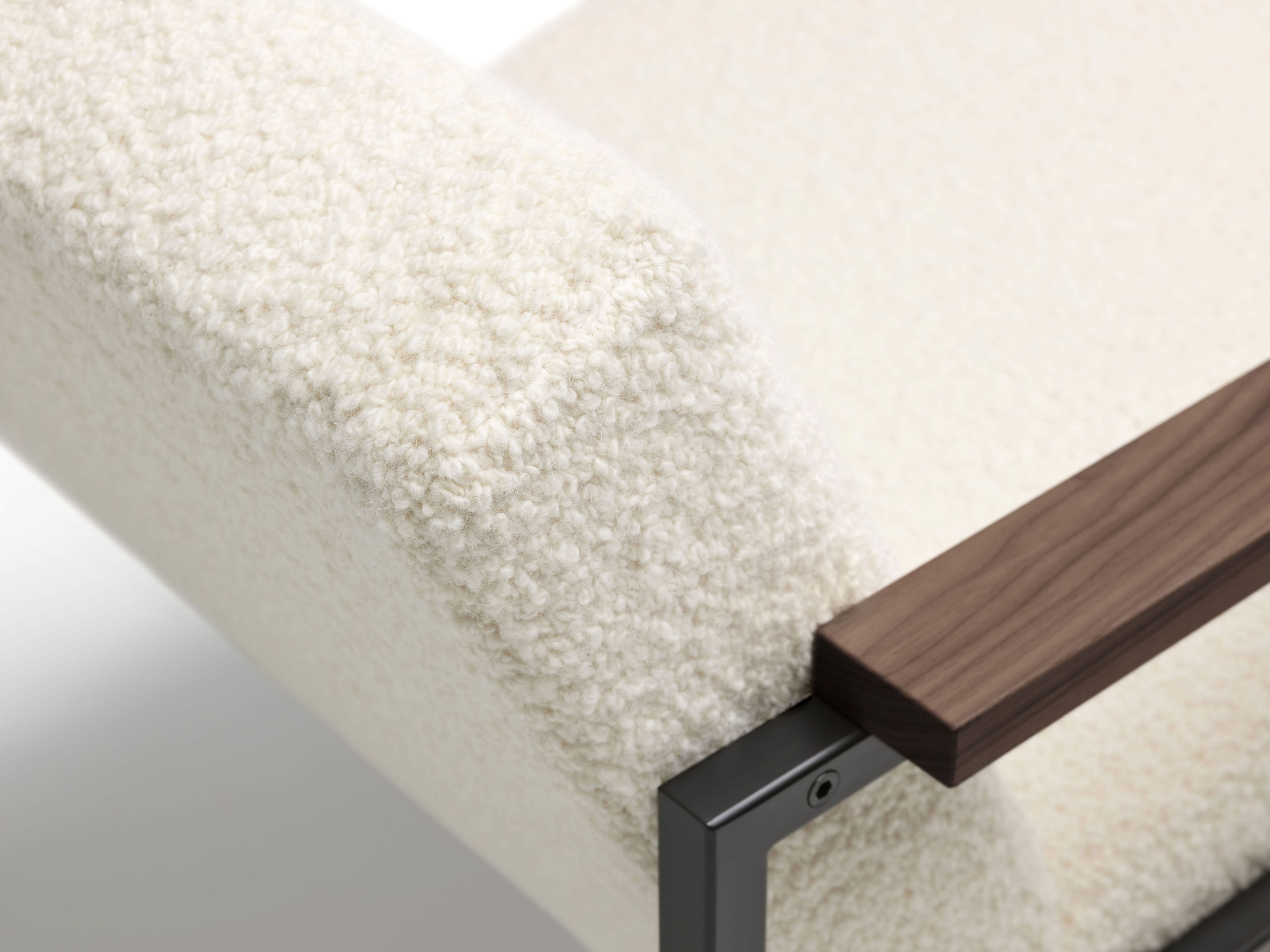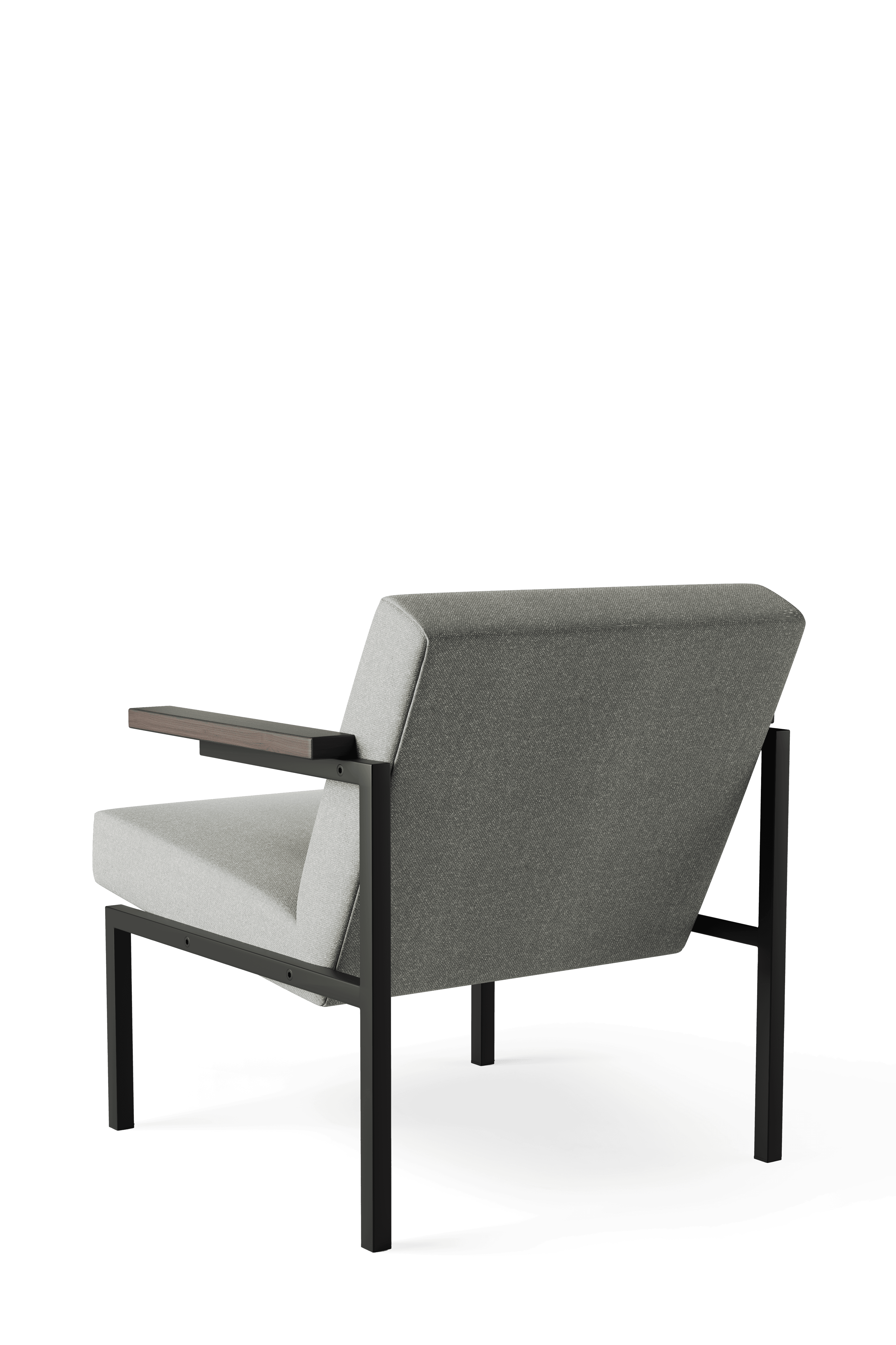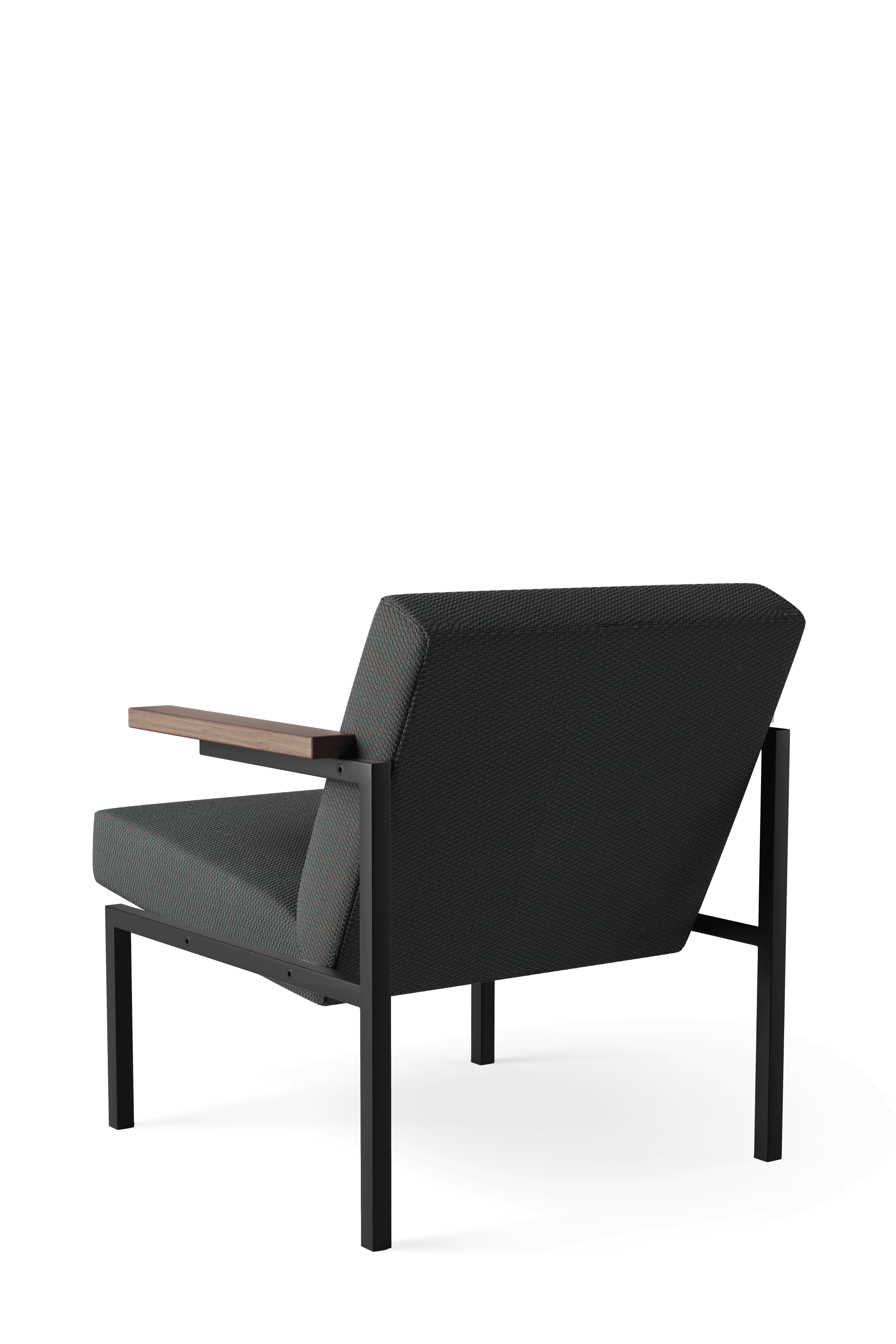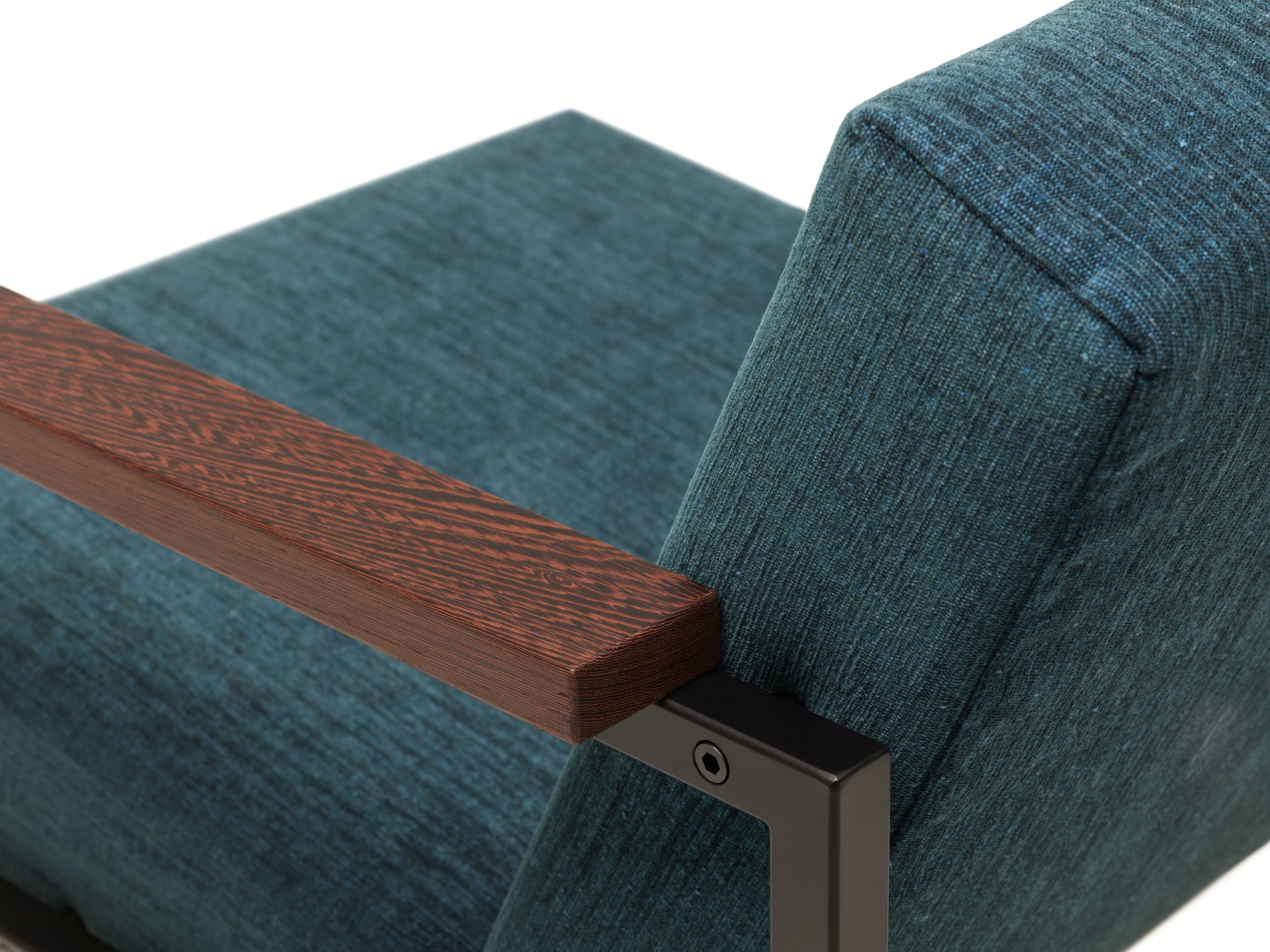 - Material descriptionFrame: black powder coated square tubular metal // armrests: solid oak (natural or dark brown) or walnut // Upholstery: choice of various fabrics and leathers