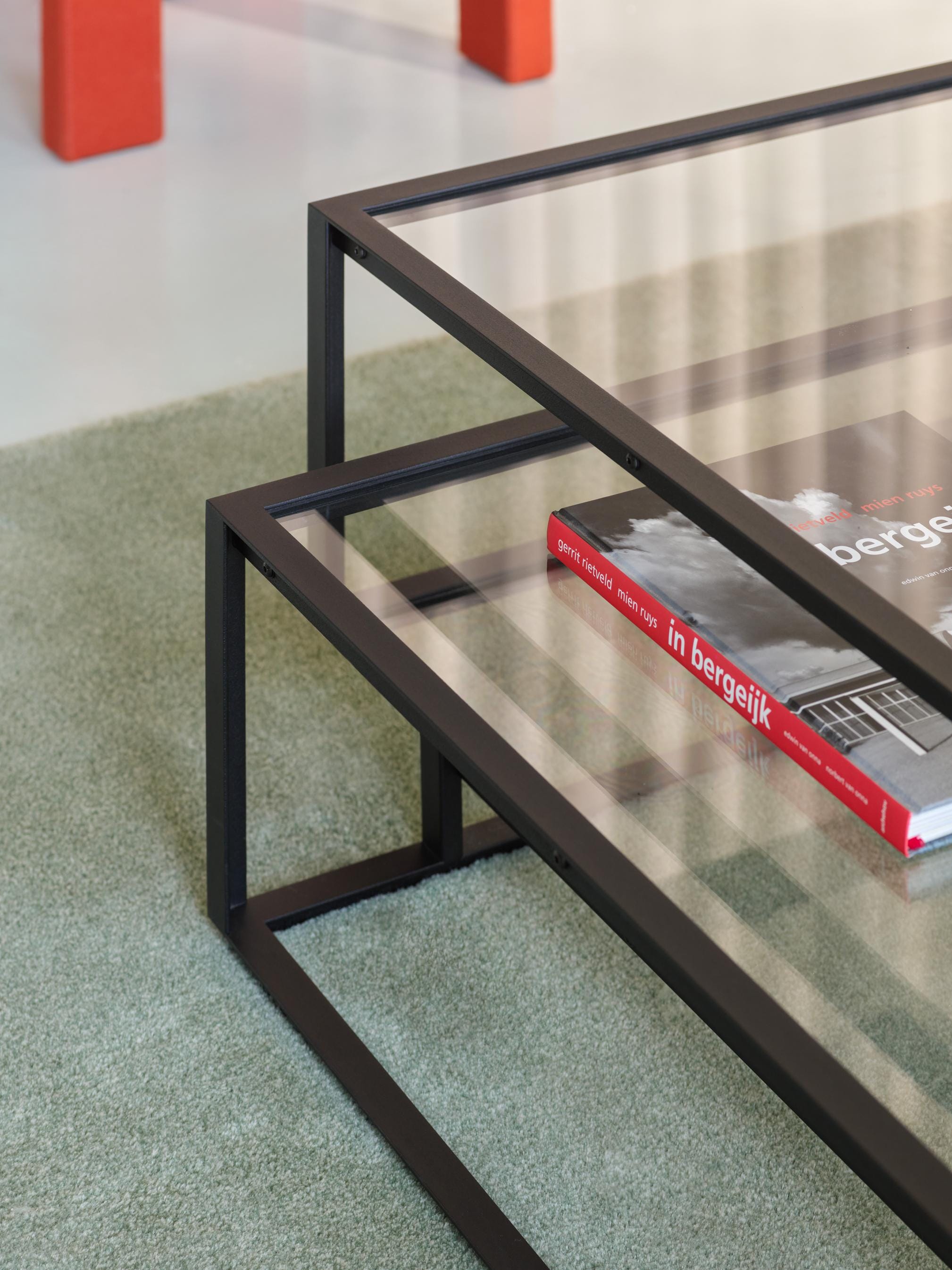 - Material descriptionFrame: Powder coated fine texture matte (black RAL 9005 or taupe RAL 7006) metal // Glass: clear glass panel // Black screws standard with black frame. Brass screws standard with taupe frame