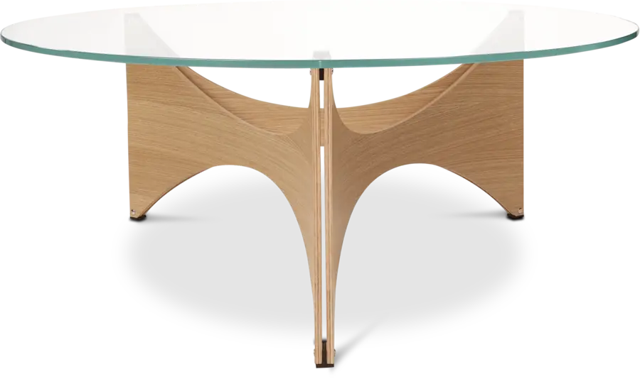 - Material descriptionBase: curved beech plywood with oak veneer, natural or black-stained finish // Top: 8 mm thick Clear Glas